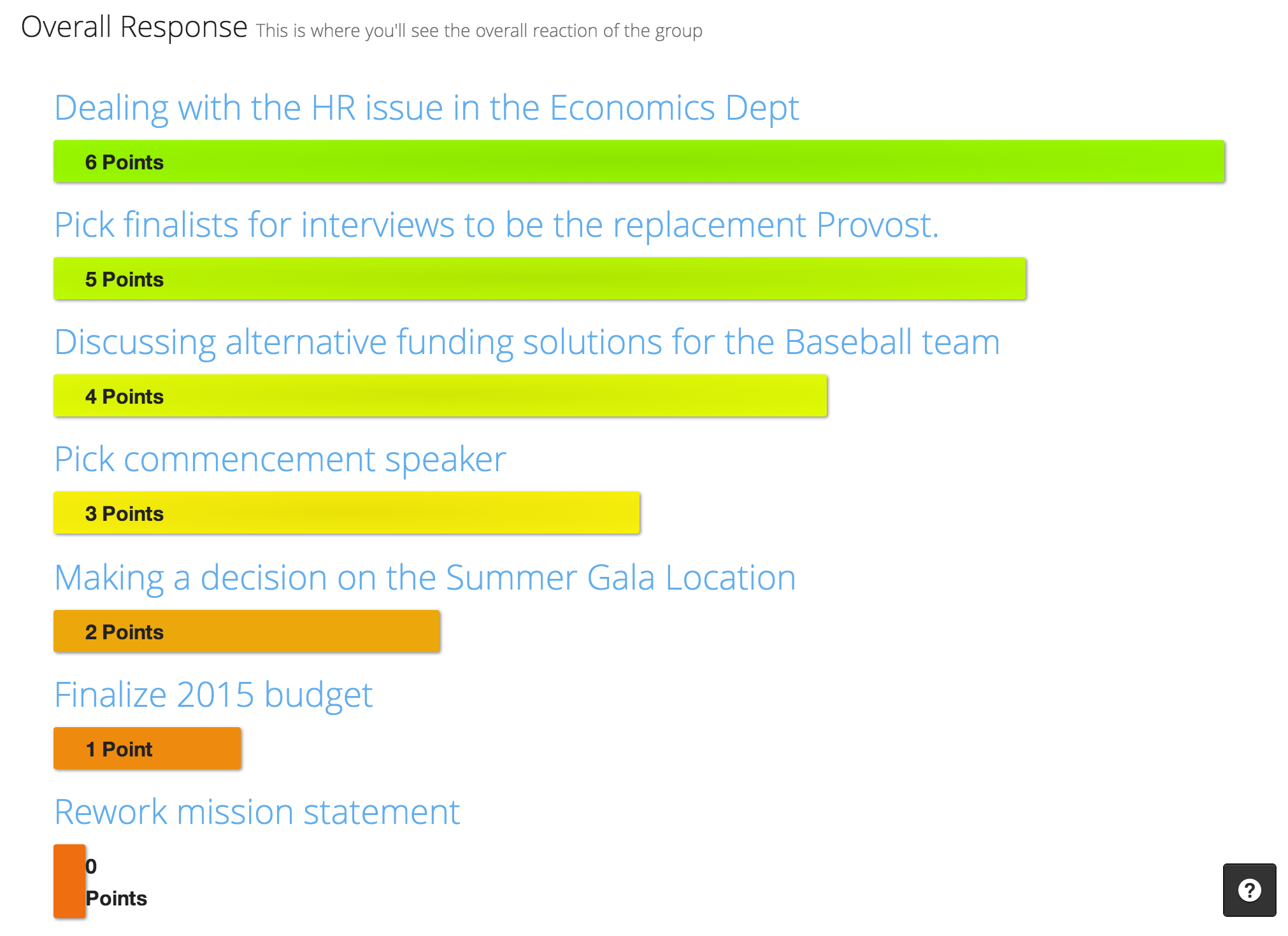 But is that the entire story? Not exactly. When we compare the individual responses we can see that Stephen has a very different priority from the rest of the group. That doesn't mean we need to spend the entire meeting on it. But the meeting facilitator should make sure to take that up directly with Stephen.